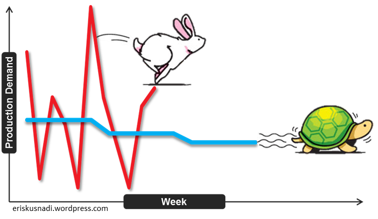Ohno (1988) : “The slower but consistent tortoise causes less waste and is much more desirable than the speedy hare that races ahead and then stops occasionally to doze” (Liker, 2004, Chap.10)