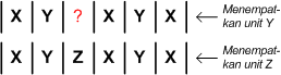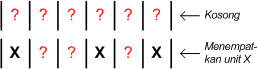 Tahap 2.1: tempatkan X (3 unit) terlebih dahulu, diusahakan penempatan berselang-seling: