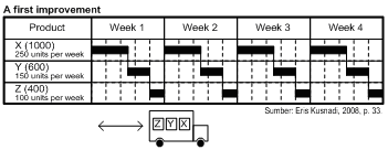 Oleh karena itu, perbaikan waktu diperlukan untuk mempertahankan pasar dan memperoleh fleksibilitas, caranya adalah dengan membagi batch melalui pencarian suatu sekuen atau pola rangkaian/susunan produk yang sesuai untuk jangka waktu yang lebih kecil (harian atau lebih kecil lagi) kemudian sekuen ini akan diulang terus sampai keseluruhan permintaan (bulanan) tercukupi. Hal ini berarti mencari suatu kompromi antara ukuran batch minimum, sisi biaya, dan upaya changeover dan skala penghematan batch besar. Konsep product leveling sangat relevan bagi lingkungan manufaktur repetitif seperti ini (TPS). Berikut akan diterangkan bagaimana langkah-langkah teknisnya: